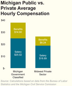 Government workers at all levels — whether they’re state bureaucrats or public school teachers — tend to receive a more costly benefits package than private-sector workers. State and local governments simply don’t face the same competitive pressures that are necessary to control their labor costs. Government also has high rates of unionization — 60 percent in the public sector compared to just 13 percent in Michigan’s private sector — that press governments to spend all they can on employee compensation.