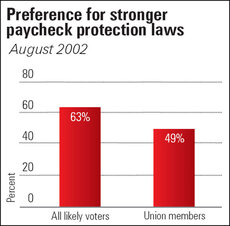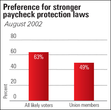 An August 2002 opinion poll commissioned by the Mackinac Center showed 63 percent support amongst likely voters for strengthening Michigan’s paycheck protection law so as to add the provisions that Mr. Hunter suggests. This poll also showed 49 percent support amongst voters who are members of unions.