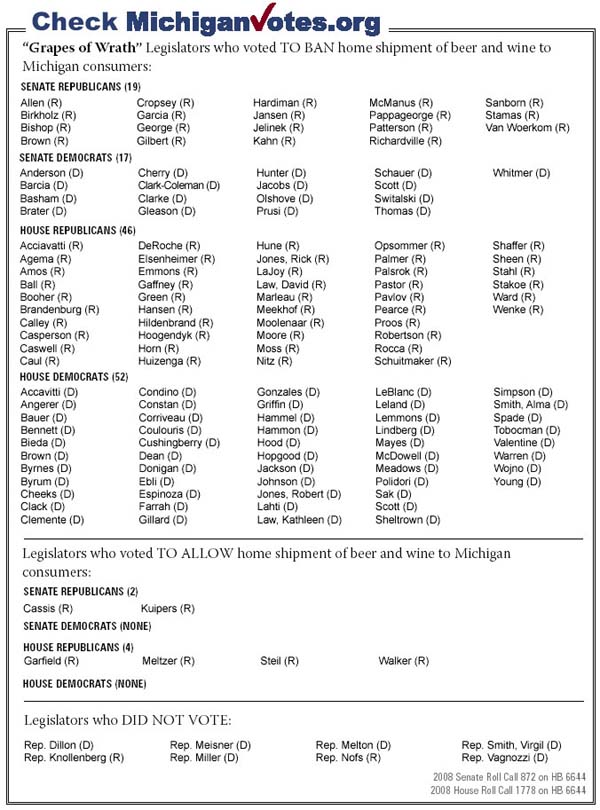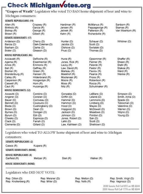 A new state law prohibits Michigan connoisseurs of wine and beer from purchasing these products and having them shipped directly to their home from out-of-state retailers. Instead, all such purchases will be allowed only through a state-endorsed wholesaler. Introduced in November 2008 as House Bill 6644, the new law was quickly passed during the final days of the 2008 legislative session. It was overwhelmingly supported by 134 of the 148 members of the Michigan Legislature, and became Public Act 474 of 2008 upon being signed by the governor and enacted on Jan. 9, 2009.