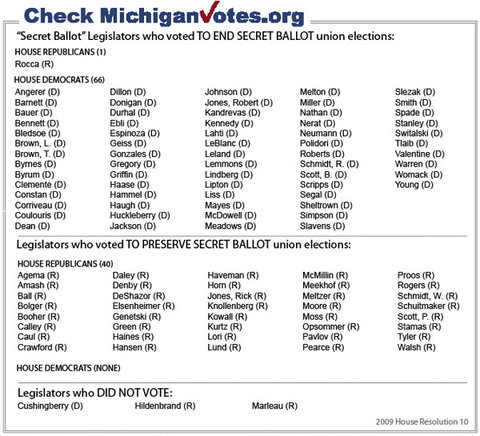 On March 4, 2009, the Michigan House of Representatives voted to approve House Resolution 10, a non-binding opinion of the chamber that asks "the United States Congress to enact the Employee Free Choice Act, which would authorize the National Labor Relations Board to certify a union as the bargaining representative when a majority of employees voluntarily sign authorizations designating that union to represent them; provide for first contract mediation and arbitration; and establish meaningful penalties for violations of a worker's freedom to choose a union." One Republican lawmaker joined 66 Democrats in favor of this resolution while 40 lawmakers — all Republicans — voted against it.
