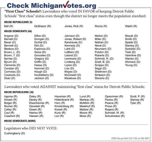 HB 4047, retaining the Detroit Public Schools' status as a "first class" district and protecting the district from additional charter school competition, was approved by the Michigan House on April 2 when five Republicans joined 66 Democrats voting in favor of the bill. There were 38 votes in opposition, all Republicans. The MichiganVotes.org vote tally is below.