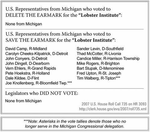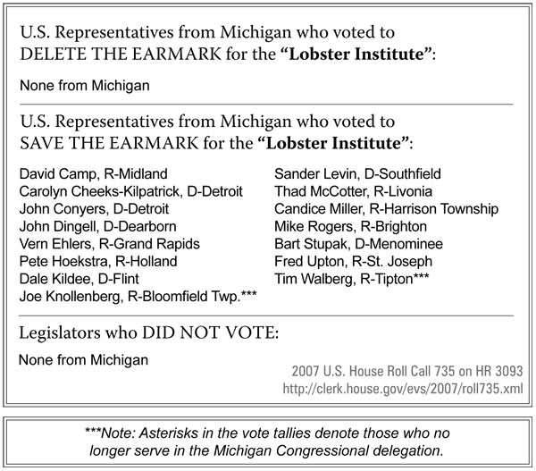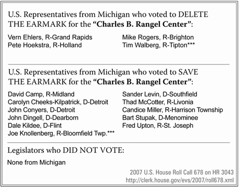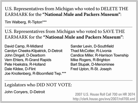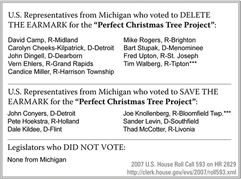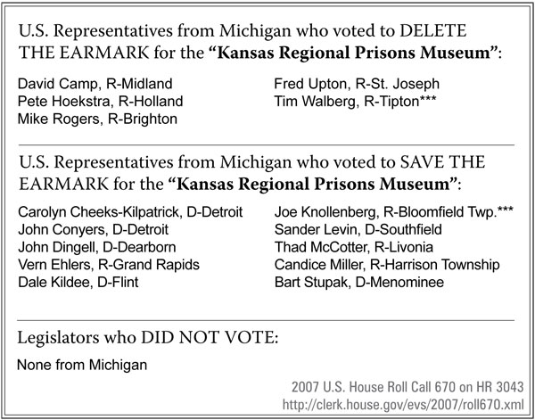 The MichiganVotes.org vote tally for the aforementioned "borrow-and-spend" votes are located to the right. Each of these votes took place during the 2007-2008 session of the Michigan Legislature, and some of the lawmakers listed are no longer in office. Some of those no longer serving have moved on to other elected offices or are announced candidates for the same. Official Web sites and campaign Web sites that could be located for these politicians are provided below.