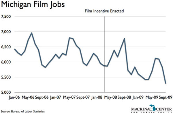 The Bureau of Labor Statistics reports that as of September 2009 (the most recent month available)*, there were 5,290 people in Michigan employed under the category of "motion picture and sound recording industries." In April 2008, when legislation was signed creating the film subsidy program, that same classification reported 5,867 jobs, or 9.8 percent more.