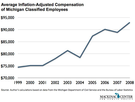 The wages and benefits of Michigan's over 50,000 state employees cost taxpayers $4.7 billion in fiscal 2008. This is up from $3.2 billion in fiscal 1999, despite the state now employing 15 percent fewer workers.