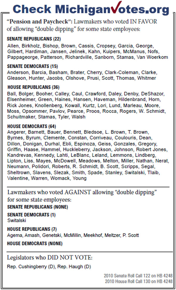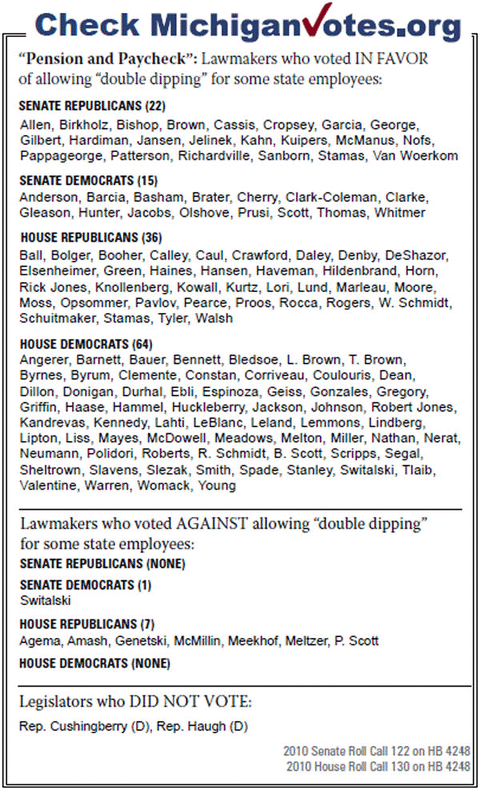 A new law will allow retired nurses who worked for the state Department of Corrections to return to a job with the department on a part-time basis and collect both their full pension payout and a salary. This "double dipping" by state workers is prohibited by a 2007 law, according to the House Fiscal Agency. The new bill was advanced because the Department of Corrections states that it has a nursing shortage and is in need of an enticement to bring more help to their facilities.