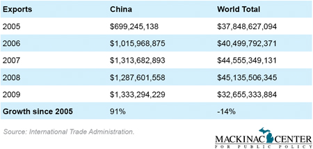 Since 2005, Michigan's exports to China increased by 91 percent, while Michigan's exports to the world dropped by 14 percent, largely due to a substantial decrease in 2009.