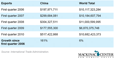 However, it appears that state exports recovered in 2010. First quarter data shows that Michigan's exports are returning to 2010 levels and that our exports to China are having a banner year.