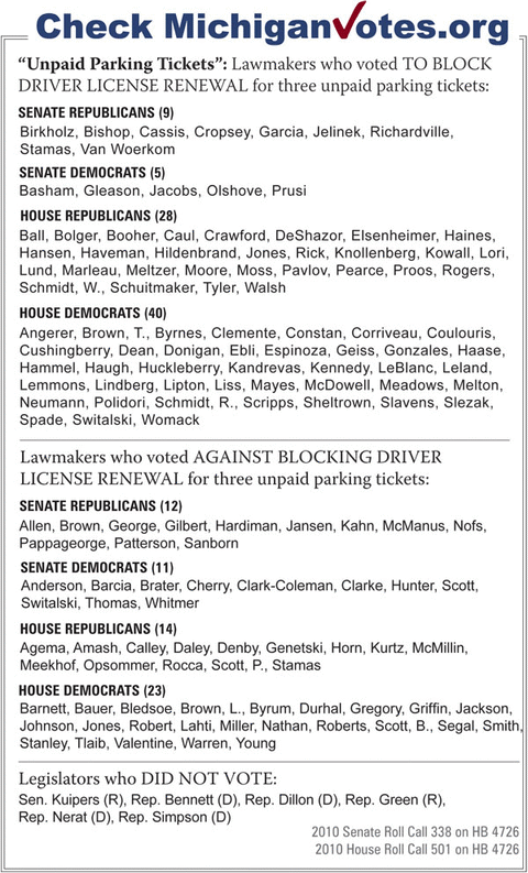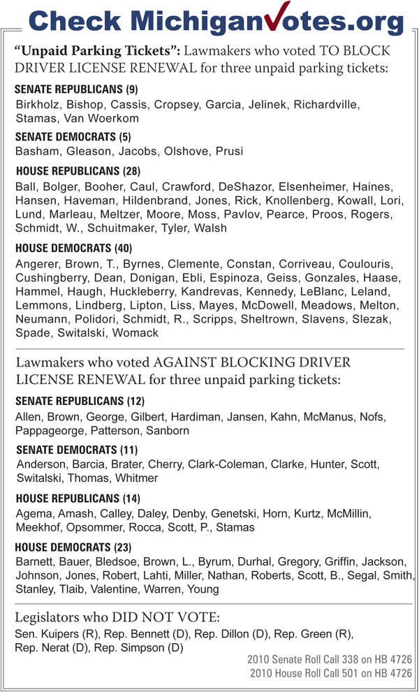 House Bill 4726, sponsored by Rep. Roy Schmidt, D-Grand Rapids, would have the Secretary of State deny a driver license renewal to any motorist with as few as three unpaid parking tickets. The bill cleared the Michigan House last October on a vote of 68-37. But on June 30, when it was brought up for a final passage vote in the Senate, the chamber overwhelmingly rejected it with a vote of 14-23.