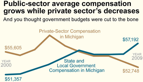 Public employee pay in this state matched and began to exceed private sector pay back in 2005, according to a recent analysis by the Mackinac Center for Public Policy. That is the year when government workers became the wealthiest class of workers in Michigan, relative to the average taxpayer who pays their salary. During the period 2000-2009, average government worker pay went from being $4,248 less than the private sector to $4,444 more. This is a swing of $8,692 per worker in less than a decade, in favor of our local version of America's most wealthy and powerful political force.