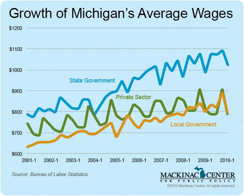 Local government and state workers’ average weekly pay surpassed that of private sector workers in Michigan in 2009, according to an analysis done by the Mackinac Center for Public Policy.