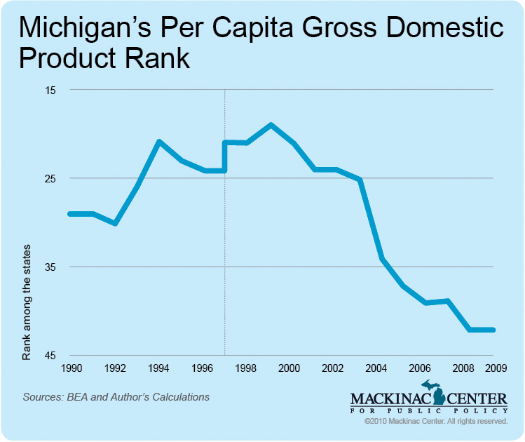 Michigan now ranks 42nd in per capita state Gross Domestic Product, the measure of goods and services production, down from 21st in 2000.