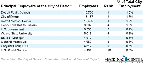 The report lists the number of jobs provided by the city's largest employers, which indicates how sensitive its finances are to the actions of a particular firm. In Detroit's case, six of the top 10 employers are not private businesses at all, but government entities: public schools, the city government, the U.S. government, Wayne State University, the State of Michigan and the U.S. Post Office. Two others are health care providers intrinsically tied to government policy, the Detroit Medical Center and the Henry Ford Health System.