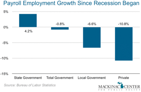 - Since the early 2000s, state and local government jobs as a percentage of total Michigan employment increased from around 13 percent to a high of 15.5 percent in 2009.