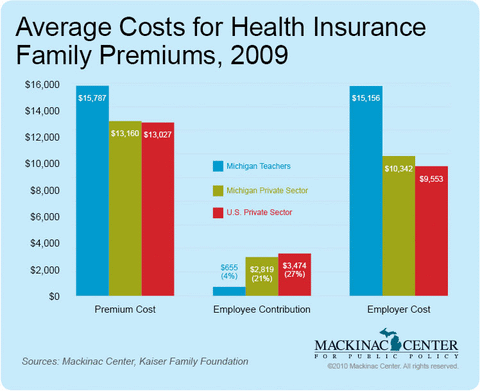 - For Michigan public school teachers, their average contribution to the health insurance premium for family plan is 4 percent. The Michigan private-sector average is 22 percent, and the average for federal employees in Michigan is about 25 percent.