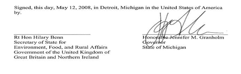 The scant news coverage of this agreement says little more than that Cherry “met in Detroit” with “the Right Honorable Hilary Benn, the United Kingdom's Secretary of State for Environment, Food, and Rural Affairs” to sign this memo of understanding on behalf of Gov. Jennifer Granholm, who was recovering from surgery.