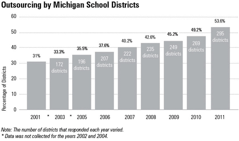 The steady, significant growth of privatization — and the associated savings — caught the eyes of Michigan legislators, who are now considering House Bill 4306. Introduced by Rep. Dave Agema, R-Grandville, this bill would mandate competitive bidding for major noninstructional services. Already, several districts have begun bidding out services in order to qualify for Gov. Rick Snyder’s “best practices” funding, which offers an additional $100 per pupil to any district that meets four out of five criteria. One of these criteria is the solicitation of competitive, private-sector bids for support services.