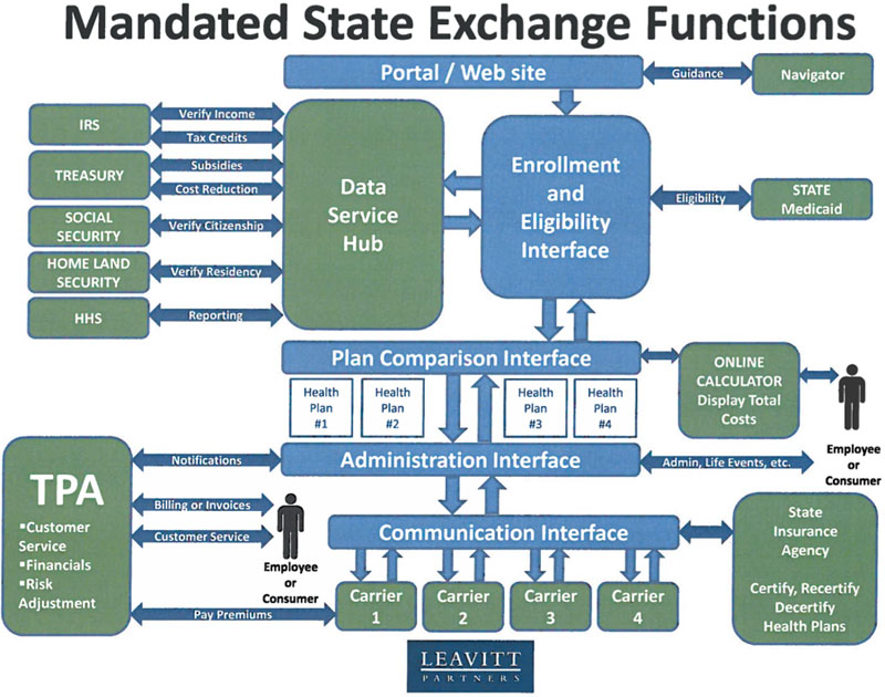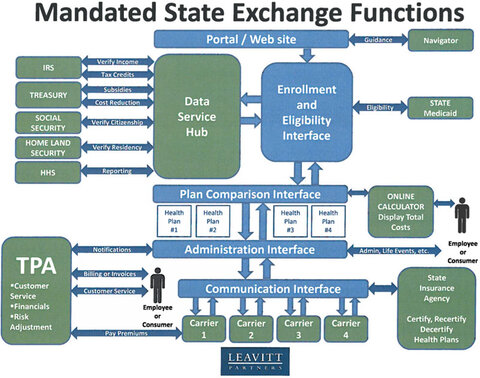 Those claims and labels were badly dented in a recent hearing of the House Health Policy Committee, where staffers from one of the corporations hoping to profit from exchange contracts presented a "Mandated State Exchange Functions" flow-chart: