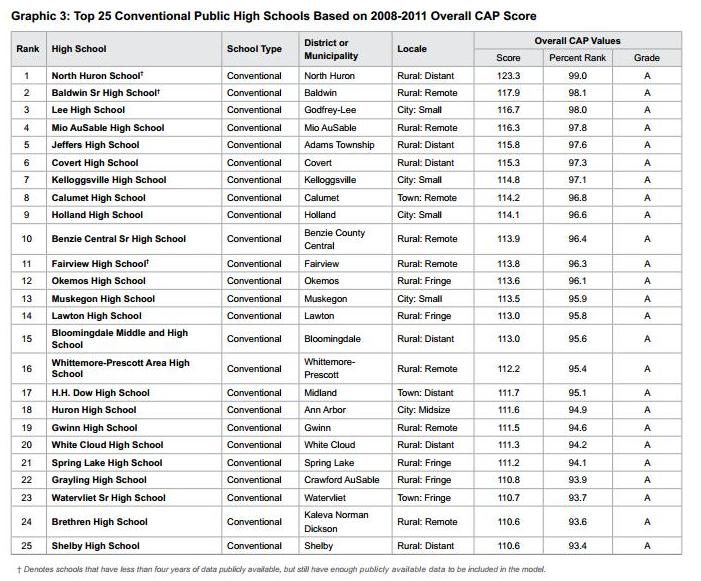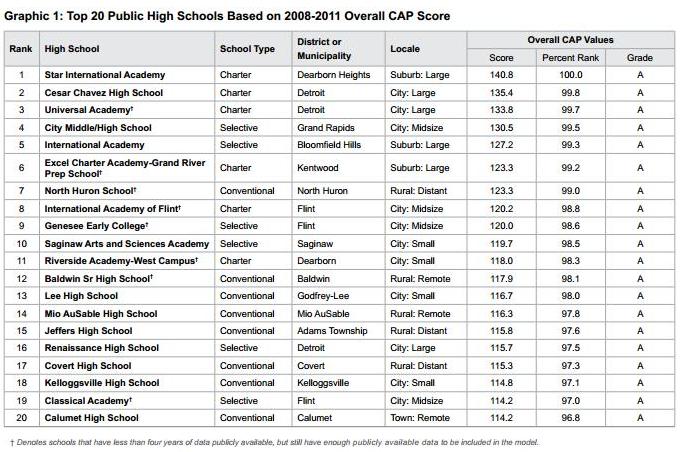 Of the top 6 best-performing high schools, four were charter schools and two were public schools that can selectively choose their students. The top-performing conventional public high school in the state was North Huron School. To see a list of the top 20 best-performing high schools, click here. To see a list of the top 25 best-performing conventional high schools, click here.