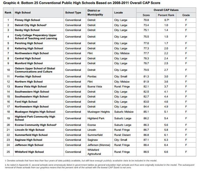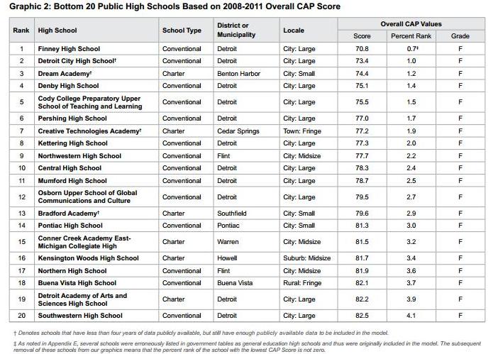 At the other end of the scale are many high schools in the Detroit Public Schools system. Of the 35 public high schools in Detroit, 25 received D's or F's, which means they score among the lowest 20 percent of schools.
