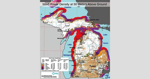 That's because almost the entire state of Michigan is “poor” or “marginal” for wind as a resource at 50 meters above ground (see image), according to the U.S. Department of Energy's National Renewable Energy Laboratory. The information says Michigan’s best wind opportunities at 50 meters, which would be classified as "excellent" and "outstanding," are all located offshore.