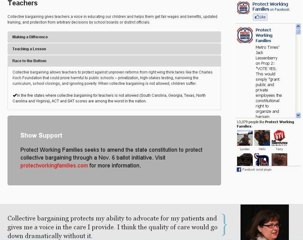 On the "Get the Facts" page (under "Race to the Bottom"), the group "Protect Working Families" (previously "Protect Our Jobs") writes: "In the five states where collective bargaining for teachers is not allowed (South Carolina, Georgia, Texas, North Carolina and Virginia), ACT and SAT scores are among the worst in the nation." There is no citation for this information, but according to the group administering the test, Michigan performs worse than those five states on the ACT. (UPDATE: The information was taken down from the website. To see a screenshot, click here.)