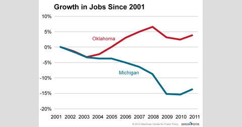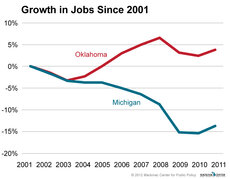 In the past decade, Oklahoma jobs are up 3.8 percent while Michigan is down 13.8 percent
