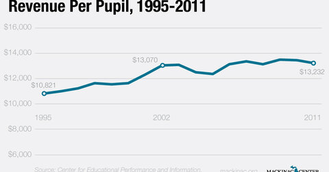 But Arsen also makes the claim that “[b]etween 2002 and 2011, real per-pupil funding of Michigan’s public schools fell by $2,643 or 24.5 percent,” suggesting that there has been a “collapse” in revenues for public schools.