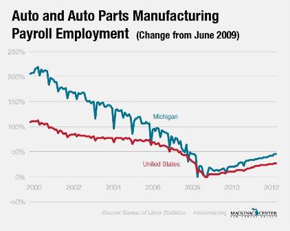 The auto industry was a factor in the different trends between Michigan and the rest of the country. Jobs in auto and parts manufacturing took huge hits in Michigan and in the rest of the country. Michigan lost 36.3 percent of its auto and parts jobs in the 2001 to 2007 national expansion compared to a 17.8 percent drop in the U.S. as a whole. The state lost a further 42.9 percent of its jobs in the recession and has since replaced over 60 percent of the jobs lost in the recession. This recovery is also slightly better than the national average.