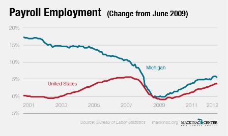 Michigan lost 5.5 percent of its jobs from November 2001, the beginning of the 2001 national expansion to the start of the recession in December 2007. The U.S. added 5.3 percent of its jobs since then.