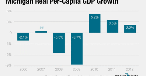 The strong performance means that Michigan surpasses Arizona in per capita real GDP, now ranking 38th among the states. This is also up from its low-point in 2009 when Michigan was 44th.