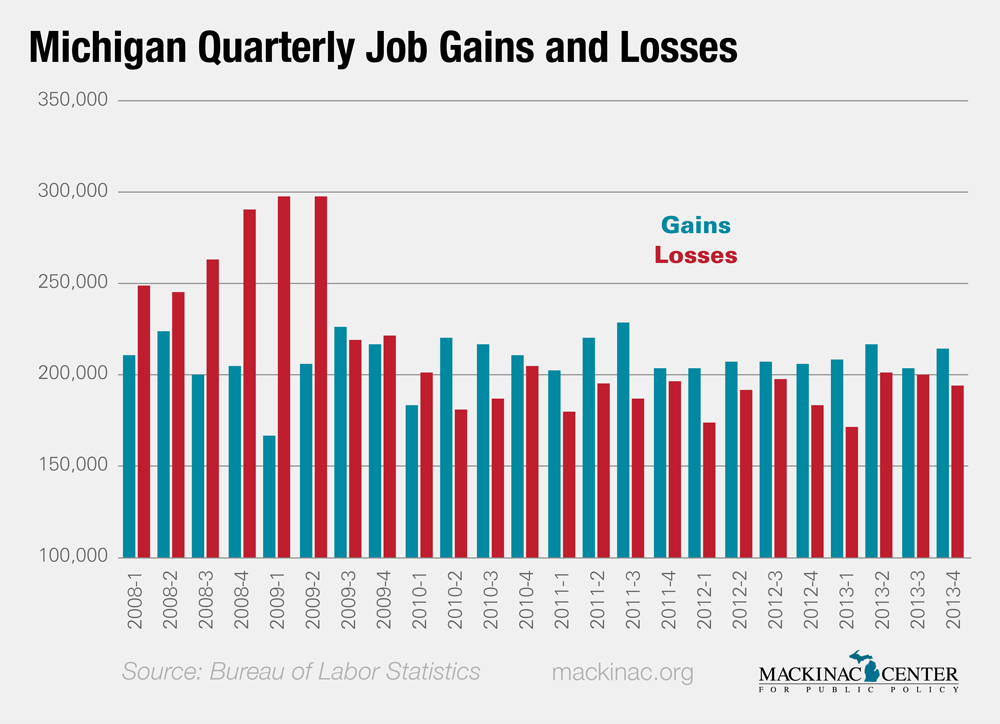 There is a surprising amount of job creation and loss in the economy. Michigan added 214,000 jobs and lost 194,000 jobs in the fourth quarter of 2013, according to the Bureau of Labor Statistics. In just three months, one out of every 16 jobs was created and one out of every 18 jobs was lost.