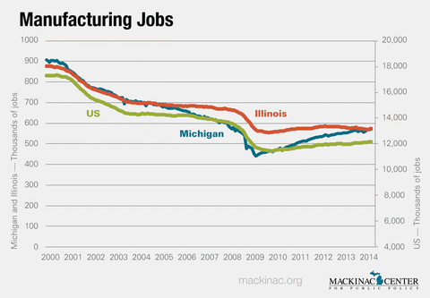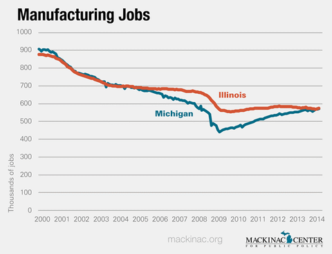 “Michigan lost a lot of manufacturing jobs from 2000 to 2009,” said James Hohman, assistant director of fiscal policy with the Mackinac Center for Public Policy. “But since then there has been a robust increase in manufacturing employment. This is true in comparison to both the United States as a whole and Illinois in particular.”
