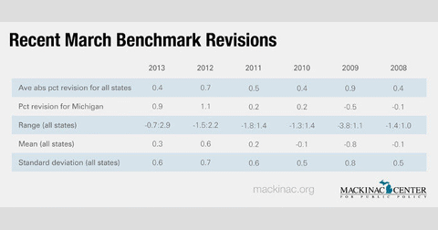 “Absolute revisions for March have averaged 0.50 percent from 2008 to 2013,” Manning said in an email. “This is slightly below the absolute average for all states during the same time frame (0.55 percent). However, the absolute revisions for Michigan for the past two years were larger than the absolute revisions from 2008-2011.”