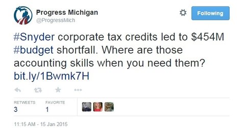 In a post on Twitter, the left-wing advocacy group Progress Michigan criticized Gov. Rick Snyder for corporate tax credits that are causing revenue estimates to be lower than previous projections.