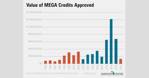 In the three-year period from 2008 to 2010 the state made 320 deals and awarded an estimated $2.5 billion in tax subsidies. The MEGA tax credit was discontinued in 2011, but the state is on the hook for paying out tax credits for up to 20 years. Gov. Rick Snyder has kept the policy of awarding tax subsidies alive via other state incentive programs.