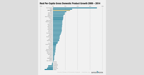 “North Dakota and Texas's growth is undoubtedly due to the oil boom that occurred over the recent years,” said Christopher Douglas, an associate professor in economics at the University of Michigan-Flint. “It will be interesting to see how these numbers change now that oil prices have hit $60/barrel.”