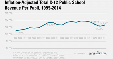 Looking further back, according to the U.S. Department of Education’s National Center for Education Statistics, when measured in 2014 dollars, Michigan public schools spent $5,623 per pupil in 1970, $7,991 in 1980 and $10,264 in 1990. These are not revenue figures, as are the ones above; they represent only spending amounts.
