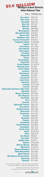 At least 70 of Michigan’s 548 conventional public school districts offer some form of paid release time (see list below). Around 40 of these pay a union employee to spend more than half their time on union business. In more than a dozen districts, local union officials are carried on school payrolls and perform no school functions.