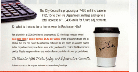 The flier states that to fix the problem the City Council is asking voters “to approve” the millage and states the tax increase would cost “less than 1 cup of coffee per week.”