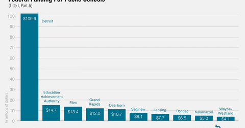 For example, in 2014-15, the federal government awarded $486.9 million to Michigan in the form of Title I-Part A funding. Detroit Public Schools, which had 47,595 students that year, received $109.6 million of that money. Schools under the state’s Educational Achievement Authority receivership (6,556 enrollment) were awarded $14.7 million. The next largest federal share went to Grand Rapids, with an enrollment of 16,546 students. It received $12.0 million.