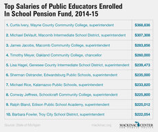 Michigan’s school pension system covers mostly employees at regular school districts, intermediate school districts and community colleges. The top ten highest-paid members of the system are all public school or ISD superintendents and community college officials.