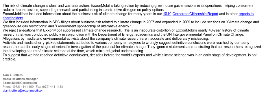 “Activists and media cherry-picked statements attributed to various company employees to wrongly suggest definitive conclusions were reached by company researchers at the early stages of scientific investigation of the potential for climate change,” Jeffers said in an email. “They ignored statements demonstrating that our researchers recognized the developing nature of climate science at the time, which mirrored global understanding. To suggest that we had reached definitive conclusions, decades before the world’s experts and while climate science was in an early stage of development, is not credible.”