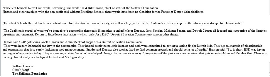 Hanson also praised the Senate-passed bailout bill and its Detroit Education Commission as “bipartisan and pragmatic.” He praised Republican senators Goeff Hansen and Arlan Meekhof for getting the bill passed. “They were hugely influential and key to the compromise.” (Click here to see Hanson's full email response.)