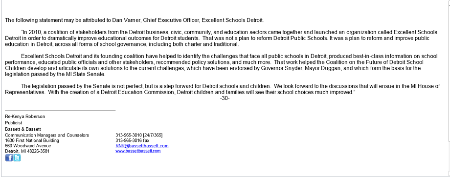 “Excellent Schools Detroit and its founding coalition have helped to identify the challenges that face all public schools in Detroit, produced best-in-class information on school performance, educated public officials and other stakeholders, recommended policy solutions, and much more,” Varner said in an email. “That work helped the Coalition on the Future of Detroit School Children develop and articulate its own solutions to the current challenges, which have been endorsed by Governor Snyder, Mayor Duggan, and which form the basis for the legislation passed by the MI State Senate.” (Click here to see Varner's full email response.)
