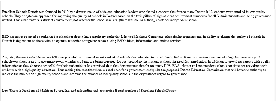 “ESD has never operated or authorized a school nor does it have regulatory authority,” said Lou Glazer, the president of the nonprofit Michigan Future Inc. and a member of the ESD’s board. Glazer has also served as a volunteer on a subcommittee of the coalition. “Like the Mackinac Center and other similar organizations, its ability to change the quality of schools in Detroit is dependent on those who do operate, authorize or regulate schools using ESD’s ideas, information and limited services.” (Click here to see Glazer's full email response.)