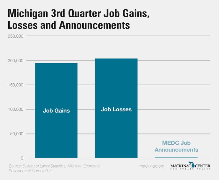 Also in the third quarter of 2015, the Michigan Economic Development Corporation announced that companies getting state support would create 1,916 jobs. So even if the programs were costless and all the promised jobs were created (they rarely are), they would represent just 1 percent of the total job creation and destruction that goes on in Michigan every three months. Plus, the awards given to these companies cost taxpayers and this calls into question whether the net effect is positive for the state.