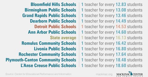 As of December 2015, DPS had one teacher for every 14.53 students, compared to the state average of one teacher for every 16.13 students. The figures come from the state of Michigan’s data clearinghouse and are based on information submitted by school districts.