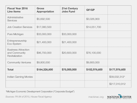 The budget the Legislature enacted for fiscal year 2016 included almost $178 million in six major items over which the Michigan Economic Development Corporation controls. Cutting this would not only help balance the budget, but could improve Michigan’s economy. Lawmakers may also be able to redirect an additional $39 million from Indian gaming monies that currently flow directly to the state’s corporate-welfare bureaucracy.