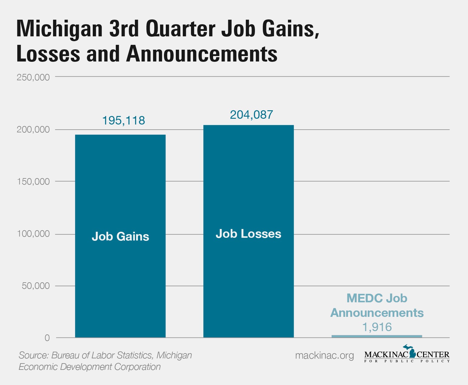 The Michigan Economic Development Corporation announced that state business subsidies would create 1,916 jobs in the third quarter of 2015. Those 1,916 projected jobs are dwarfed by the normal and ongoing churn of the state economy. And the job promise numbers are probably overstated too: A September 2013 report by the Office of the Auditor General said that only 19 percent of those projected MEDC jobs ever came to fruition.