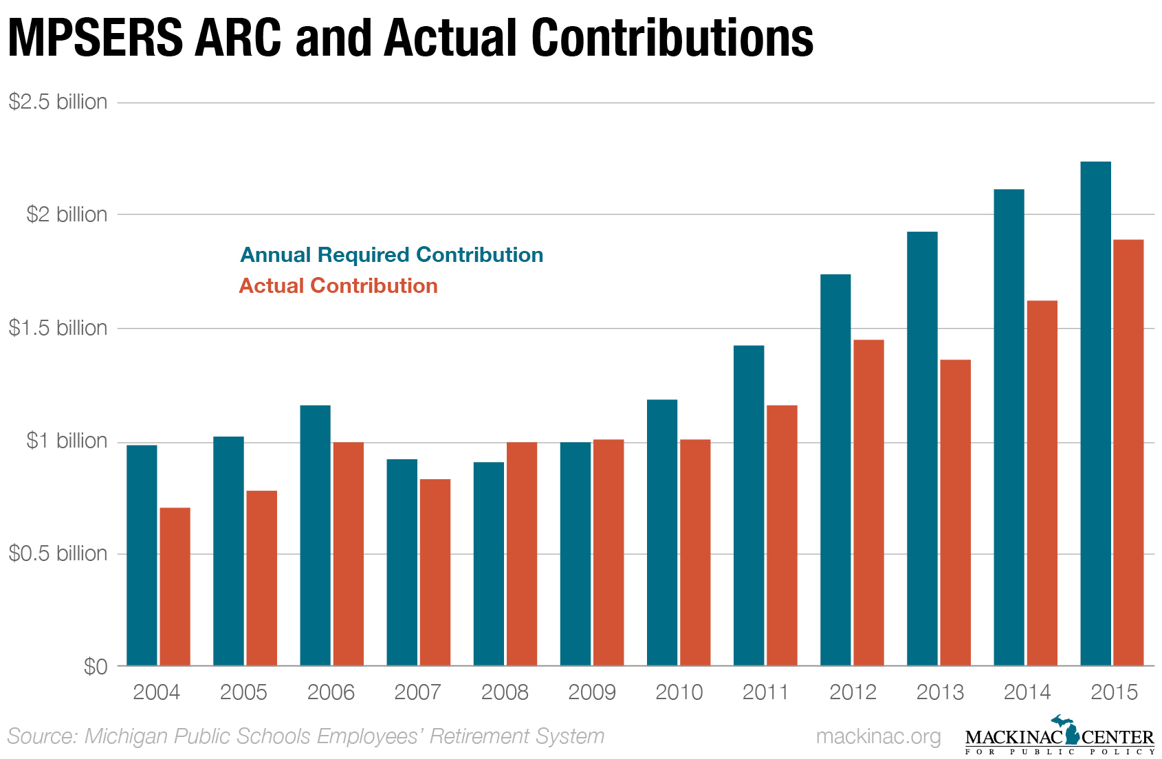 The “ARC” is the minimum contribution needed each year to cover new pension promises and keep up with the state's plan to gradually catch up on past underfunding. It was $1.2 billion in 2010, but continued underfunding drove the figure up to $2.2 billion in 2015, which was also the sixth year in a row the state did not meet the requirement. (It actually paid in $1.97 billion.) Increased spending on pensions crowds out other state spending and pressures lawmakers to increase taxes.